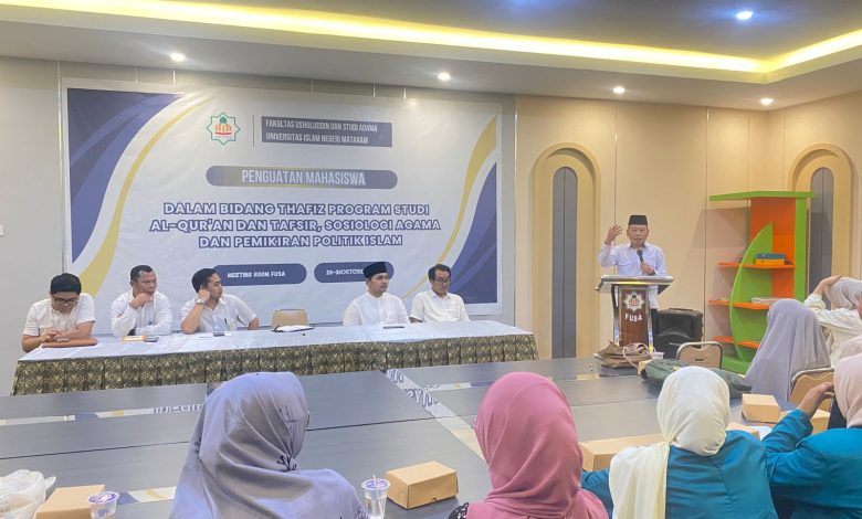 Mataram, 27 Oktober 2025– Dalam rangka merawat keberlanjutan persemaian prestasi-prestasi mahasiswa di bidang Tahfidz, Fakultas Ushuluddin dan Studi Agama UIN Mataram menggelar Penguatan Kompetensi Mahasiswa dalam bidang Tahfidz. Acara yang diikuti oleh 30 peserta dari tiga Program Studi; Ilmu al-Quran dan Tafsir (IQT), Sosiologi Agama (SA), dan Pemikiran Politik Islam (PPI), diselenggarakan di tiga lokasi utama; Meeting Room FUSA sebagai lokasi acara Pembuka, Ruang Kaprodi IQT dan Musholla FUSA UIN Mataram.